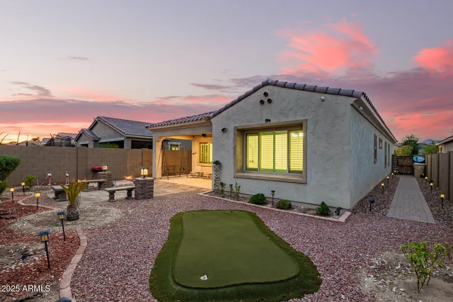 Price Reduced.... WON BEST OF TOUR! Turn-key 3bed 2 bath plus den home in Blue Horizons in Buckeye! You're welcomed by an open layout with lots of natural light, high ceilings, a neutral palette, classic plantation shutters, and beautiful flooring. The gourmet kitchen showcases granite counters, crisp white cabinetry with crown moulding, pendant/recessed lighting, a tile backsplash, stainless steel appliances, a walk-in pantry, and an island with a breakfast bar for casual meals. You'll also find a den, could be a 4th bedroom. A versatile space for work or play. The primary bedroom boasts an ensuite with double sinks and a walk-in closet and a large tiled shower. Enjoy breathtaking sunsets in the large backyard, complete with a putting green and a covered patio for dining al fresco. This home can be sold FULLY FURNISHED. Blue Horizons community features amazing parks great for family get togethers, complete with sand volleyball courts, basketball, soccer fields and multiple play areas. Close to I-10, Costco, Verrado shopping and just 20 minutes to downown Phoenix. Near multiople hiking, biking and recreational areas. A rated schools and so much more. Make this awesome listing your new home.