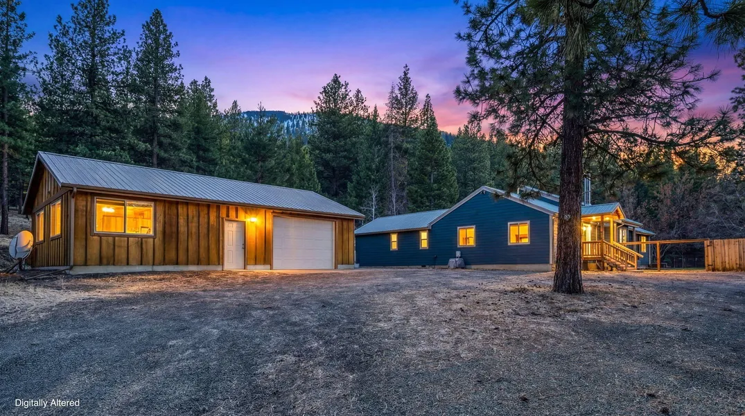 Beautiful five-acre property nestled in the pines and bordering BLM land, offering privacy and access to the outdoors. This 2,412 sq ft home features four bedrooms and three bathrooms with pine accents throughout. The main primary suite includes a sliding glass door to the covered back deck, double vanity, soaking tub, tile shower, and walk-in closet. A second primary suite offers a shower surround and closet with bypass barn doors. Stay comfortable year-round with a Blaze King woodstove and a ducted heat pump. The 1,040 sq ft detached garage/shop includes a concrete floor, insulation, sheetrock, 220 power, and an oil monitor stove. Additional features include a 12' x 10' hickory storage shed, fenced backyard for pets, partial perimeter fencing, well, septic system, backup generator wired to the house, and a circular driveway. This property is situated only a few minutes away from town.