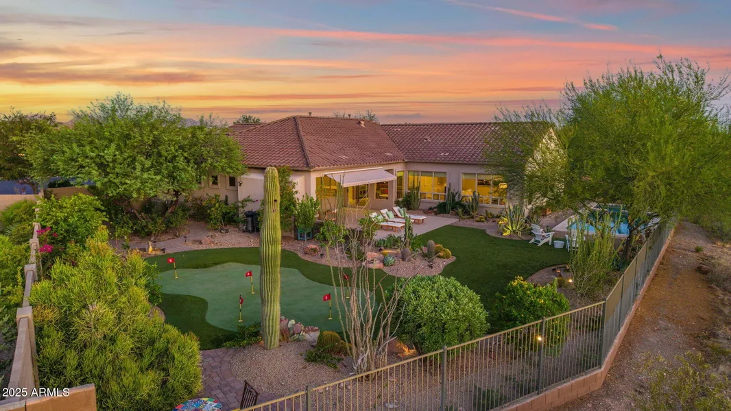 Tucked away on an oversized cul-de-sac lot with spectacular Arizona sunsets and mountain views, this residence is the perfect blend of luxury, comfort, and elevated outdoor living. At the heart of the home is a spacious great room framed by large windows, bathing the space in natural light and showcasing the serene desert backdrop. The gourmet kitchen anchors the layout with a 48'' gas range, double ovens, custom cabinetry, and generous island, ideal for both entertaining and everyday living. A formal dining room offers a refined space for hosting, while a dedicated office provides a quiet retreat for work or flexible living. Step outside to your own private resort-style backyard, featuring a new heated saltwater pool and spa, a custom putting green, and a cozy outdoor gas fireplace, all thoughtfully positioned to enjoy Arizona's dramatic skies and peaceful evenings. The spacious pr...