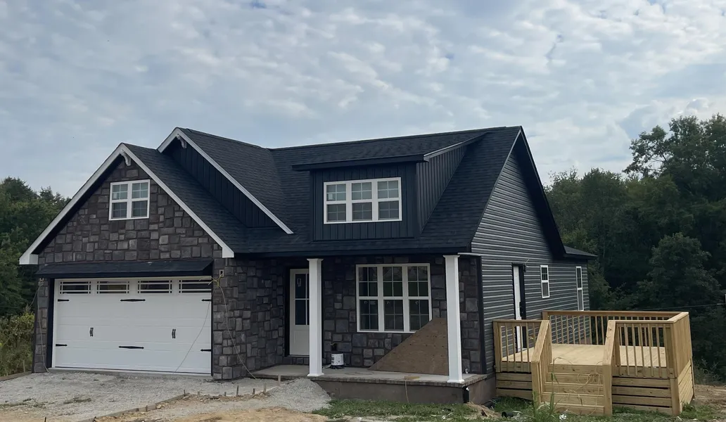 New Construction home in exclusive Queen's Crest Subdivision in East Bernstadt. The custom stonework front brings high quality curb appeal. Unique design layout allows for flexibility options. High grade hardwood flooring throughout the home. The kitchen boasts custom cabinets with a bar table for family style meals. Stainless appliance package included. The primary bedroom has a walk-in closet and an ensuite bath with more custom cabinets and marble vanity. The cathedral vaulted ceiling makes the living room soar with dramatic height. The 12x16 deck out back ensures easy inside to outside entertaining. The 2-car attached garage with a single 16-foot door allows for larger vehicles to be used. Construction can be completed within 4 (+/-) weeks. Interior photos to be done after construction is complete.