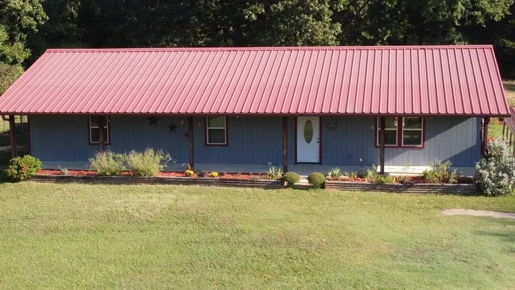 Peaceful, secluded country retreat on 10.18 wooded acres. Enjoy the serenity from the covered front porch that runs the length of the house with a view of one of the two ponds and creek. No neighbors to be seen and no known restrictions! This custom ranch style home was thoughtfully constructed to last with an engineered reinforced slab, sound deafening insulated walls and super-efficient foam insulation in attic. HUGE living room with vaulted beam ceiling. Fabulous country kitchen with TONS of cabinets and counter space, commercial vent hood, double ovens, trash compactor, apron sink and beautiful picture windows. All the bedrooms are a generous size with walk-in closets and ceiling fans. The comfortable primary suite features an over-sized soaking tub, separate shower and big walk-in closet.