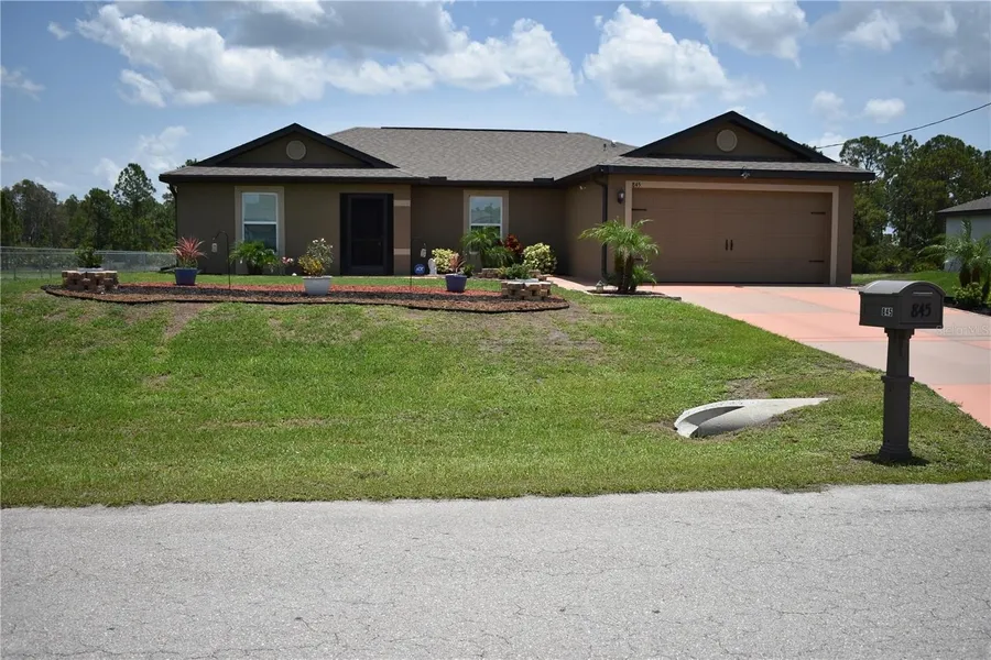 Built in December 2020, this thoughtfully designed single-family ranch-style home combines modern comfort with tasteful upgrades. Featuring an open-concept layout, custom interior paint, and stylish window treatments, this home offers a warm and inviting atmosphere throughout. The spacious kitchen seamlessly flows into the dining and living areas and is perfect for entertaining. Enjoy granite countertops, a large central island, stainless steel appliances—including a new refrigerator—and generous cabinet space. Premier wood laminate flooring extends throughout the home, offering durability and elegance in every room. Each bedroom boasts ample closet and storage space. The home is equipped with central heating and air conditioning, impact-resistant windows, smoke detectors, a new washer, dryer, and hurricane shutter panels for added peace of mind. Security features include ADT monitoring and solar- and battery-powered cameras. The two-car garage includes thermal barrier insulation on both the ceiling and garage door panels, helping to maintain comfortable temperatures year-round. Outside, the oversized lot is beautifully landscaped in both the front and back yards. The front yard features an irrigation system, while the expanded 10' x 10' back patio and partially fenced yard provide a great space for relaxation or outdoor gatherings. There’s ample room to install a swimming pool, with serene views of a dedicated County Preserve offering privacy and natural beauty. Constructed with durable block and stucco over a concrete foundation, the home also features a septic system and a 25-year shingle roof warranty. Located in a quiet, non-gated community with no HOA, you’ll enjoy the freedom to personalize your property without restrictions.