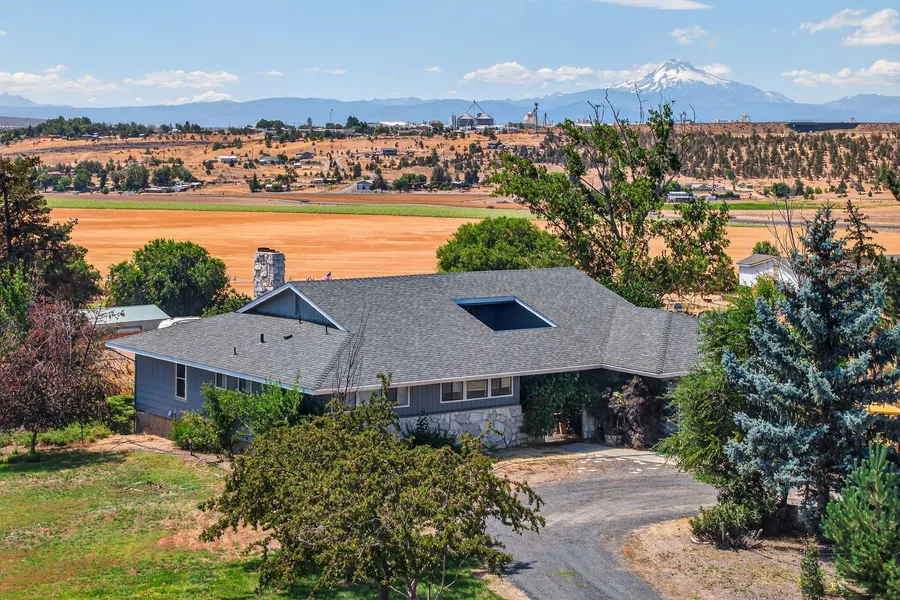 Stunning 5-bed, 3.5-bath retreat on 5 private acres with panoramic Cascade mountain views. Nearly 4,000 sq ft, split between two levels and with full kitchens on each floor, dual fireplaces, wide hallways, spacious rooms, and abundant storage. This is truly a unique house for those looking for some extra living space. Enjoy 4.6 acres of water rights, fenced yard/pasture, 30x30 pole barn, and attached 2-car garage. Recent updates include a newer roof (2019), hot water heater, 2 pressure tanks, septic system (2022), and fencing. Step out on the upper deck to enjoy views of cascade mountain peaks. Explore this peaceful setting with room to roam--perfect for country living, raising animals, hobbies, or simply enjoying the wide-open space.
