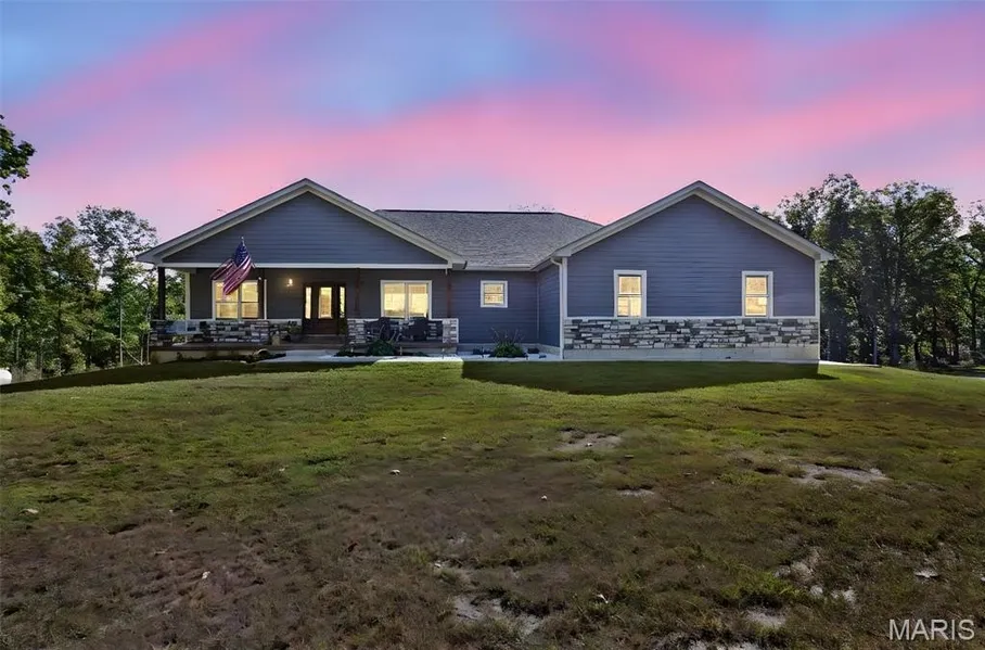 Experience the perfect blend of luxury and country living in this custom-built home. The exterior showcases beautiful stone accents, LP SmartSide wood siding, and a 3-car attached garage. A massive 40x70 detached garage includes three overhead doors, a 28x40 lean-to with two additional bays (one ideal for RV or camper storage), rough-in for a bathroom, loft area, and 200-amp service.
