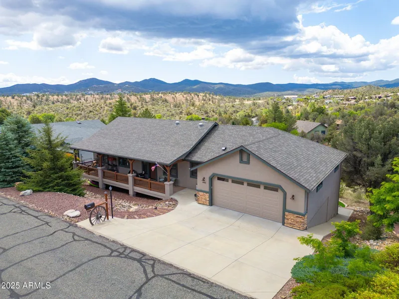 Entertainer's Dream Home in beautiful Yavapai Hills! This 2,639 sq ft home offers 3 bedrooms, 3.5 bathrooms, and bonus room that could serve as a 4th bedroom. Spacious family room featuring a beautiful stone hearth fireplace. Great kitchen with ample and attractive cabinetry and a center island with cooktop. Soak in BREATHTAKING PANORAMIC VIEWS from any of the 3 covered trex built patios.. The back patio is adjacent to a a 240 sq ft upscale bar room complete with fine cabinetry, granite countertops and undercounter refrigerators is ideal for outdoor gatherings. Downstairs takes you to the private separate entrance for a 1 bdrm, 1 bath unit with a large living room and kitchen area. perfect for multi-generational living, rental opportunities or entertaining! Lots of storage spaces through house. and an oversized two car garage with 9 ft ceilings. Backyard features easy maintenance artifi...