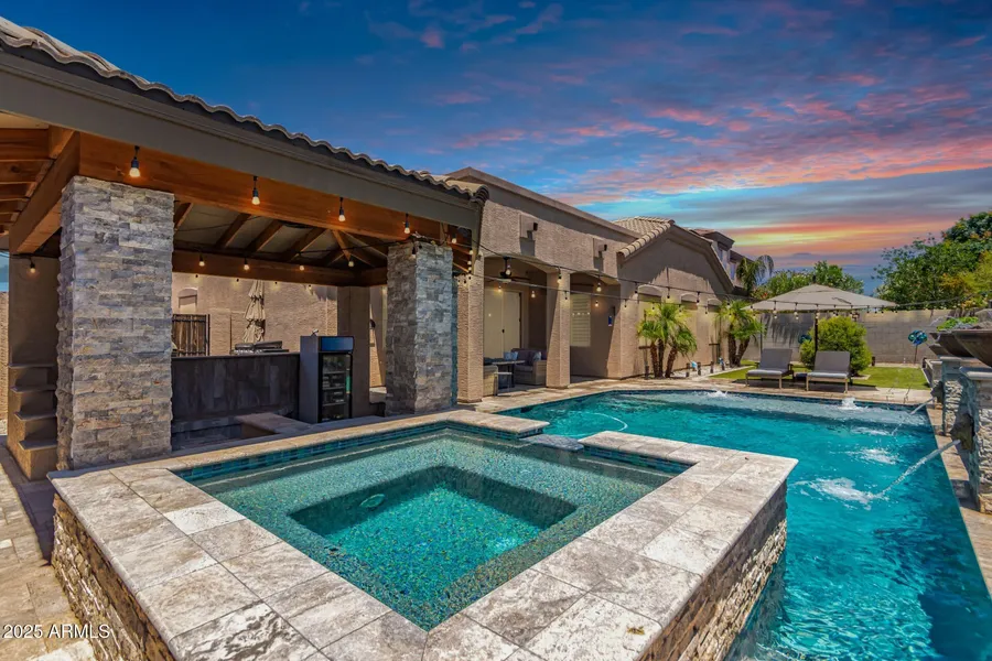 Live every day like you're on vacation in this Queen Creek retreat! Enjoy morning coffee by the heated pool and evenings under the sunken ramada, imagine dinner at the swim up bar or relaxing in the spa after a long day. Thoughtfully designed with quality craftsmanship, this semi-custom home features beautiful Mid Continent cabinetry throughout with pull-out shelves in the kitchen, fresh paint, updated lighting, and cooled garages that double as hobby or fitness space. The layout flows easily for entertaining or relaxing at home, with an outdoor setting that defines Arizona living. Priced to allow for your own personal touches this home offers the perfect balance of comfort, character, and opportunity, ready for you to move in and make it your own.