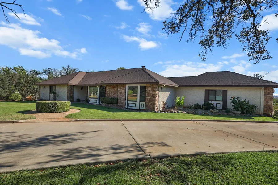 Beautifully maintained home on 2 Acres with Solar & New Roof! This well-designed and charming 2,800 sq ft home offers character and functionality throughout, featuring exposed vaulted wood ceilings and a impressive floor-to-ceiling stone fireplace. The spacious kitchen includes granite counters, an eating bar, and direct access to the formal dining area, pantry, and back deck—perfect for entertaining. The primary suite offers private deck access, a walk-in closet, and a luxurious bath with dual sinks, a jetted tub, and separate shower. Set on over 2 acres of manicured grounds with a circular driveway, fenced backyard, and plenty of parking for RVs or boats. Garden and chicken coop plus wildlife in the neighborhood! Recent upgrades include a brand-new roof and solar system, providing comfort and efficiency in one exceptional Red Bluff property in a desirable location!!