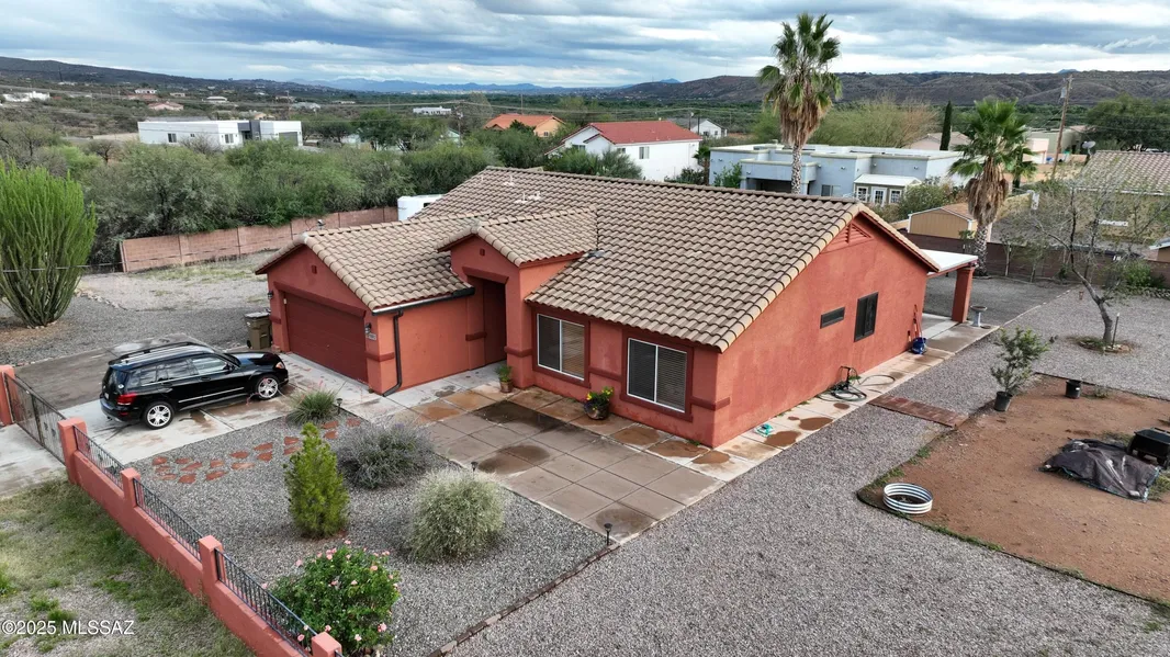 Move-in ready 3BD/2BA home with 1,617 SqFt on over 0.5 acre in peaceful Rio Rico! This single-story layout features a split floor plan for privacy, vaulted ceilings, and tile throughout main living areas. The updated kitchen boasts granite countertops, stainless appliances, and abundant cabinetry. Spacious living room opens to a covered patio and walled backyard. Primary suite includes a walk-in closet and dual vanity bath. Two additional bedrooms share a full hall bath. Laundry room, 2-car garage, and no HOA! Gated front entry and scenic mountain views complete this well-maintained 2001 home.