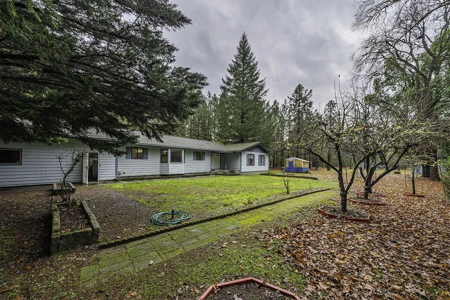 You will love the feeling of privacy in this well-built ranch style custom home. Located on 9.82 flat usable acres boasting abundant native plants and soaring pine trees. Inside you are greeted by a specious kitchen w/ beautiful original oak cabinets & tile counter top. Large living room & separate family room w/ wood stove & built-in cabinets, two skylights for lots of natural lighting & access to an enclosed covered patio. Breakfast nook & separate dining room. Laundry room w/ wash sink, built-in cabinets & walk-in pantry. Great primary bedroom w/ private en suite bathroom. Two additional bedrooms & bathroom w/ double vanity. In addition, there is another bedroom & full bathroom off the garage for additional living space. Outside boasts an additional 2 car garage/shop, garden shed, chicken coop, garden area & fruit trees. Give this home your own updating touches to make it feel like yo...