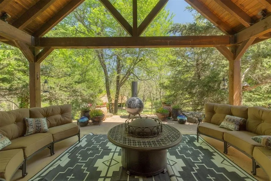 This is a must see property to fully appreciate all of the details and what it has to offer! From the minute you drive in through the beautiful metal electric gate this unique property has 10.25 acres with 4 shops. The largest shop is 60x40 has an apartment/full bath, porch, covered parking and a storage barn. The home comes with a whole house Generac generator. You will love the gorgeous hickory wood floors through house and designer carpet in the master bedroom. The floor to ceiling rock wood burning fireplace speaks for itself! Every room has gorgeous views of the lush property with mature trees and a spring fed creek! This home has tons of storage, cabinets and counter space. The master bathroom has 2 large walk in closets of which one holds the safe room/storm shelter, double sinks, walk in shower and large corner jet tub. The 2nd floor has a nice size loft area used for office/playroom etc and there are 3 bedrooms and a full bath. The 4th bedroom can be used as an additional living room/ theatre room etc. Quality deluxe in all of the selections, name brand HVAC and attention to detail at every turn. The back patio is pure relaxation with large dining, living and entertaining space. The guest house has a full kitchen, washer & dryer, bedroom, living room and full bath. Reserve your time to view this breathtaking property and prepare to be amazed! Buyer to verify schools!