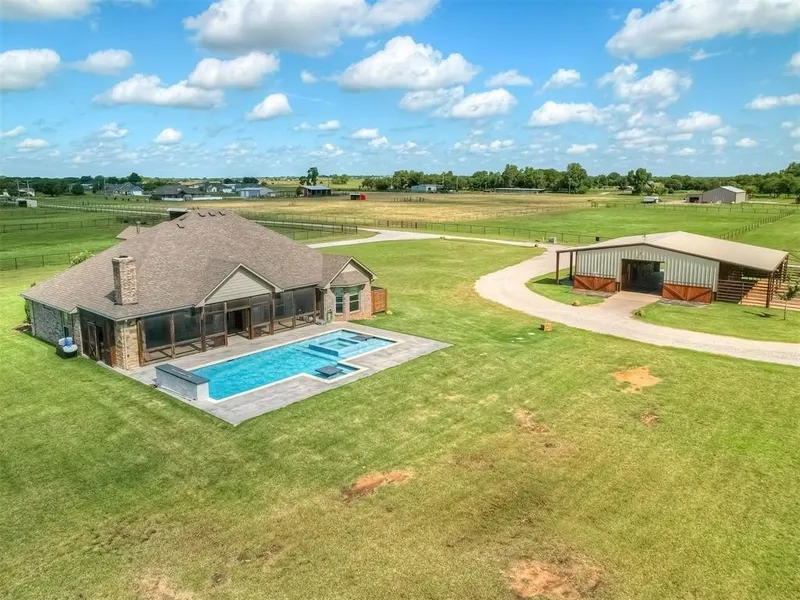 Come check out this custom turnkey property on 15 acres. Located only minutes from Norman and 1 mile off of hwy 74 in sought after Washington school district. This property features a gorgeous house with a beautiful dining room and huge screened in outdoor area with large pool and hot tub. Stained concrete floors, granite counter-tops, custom built-ins and finishes throughout. The house also features many other extras including a large walk in safe room, water softener, buried propane tank, buried power from the road, over-sized garage, sprinkler system, dual fuel heat pump, double sided fireplace, plumbed gas grill, and outdoor fireplace. The entrance has an electric gate with a keypad entry. The 40'x50' barn has six 12'x12' stalls with four 12'x30' covered runs and a 30'x50' hay barn that could easily be used as a shop. Both barns are wired with 30 and 50 amp service, lighted, and ran on a separate meter than the house. The horse barn is also plumbed with water, sewer, electrical plugs throughout, and has a large insulated tack room. There are frost free hydrants located throughout the entire property and the horse pastures include automatic horse troughs. The acreage is also fenced and cross fenced with pipe,cable, and horse fence. There are four 200'x330' pastures with two 30'x15' steel lined loafing sheds with 30'x50' pens. There are 3-4 more pastures on the 5 acres depending on how you use the gates. On the back of the property there is a 150'x200' sand filled riding arena fenced in with lights wired in and working. This property is a horseman's dream and made to function.