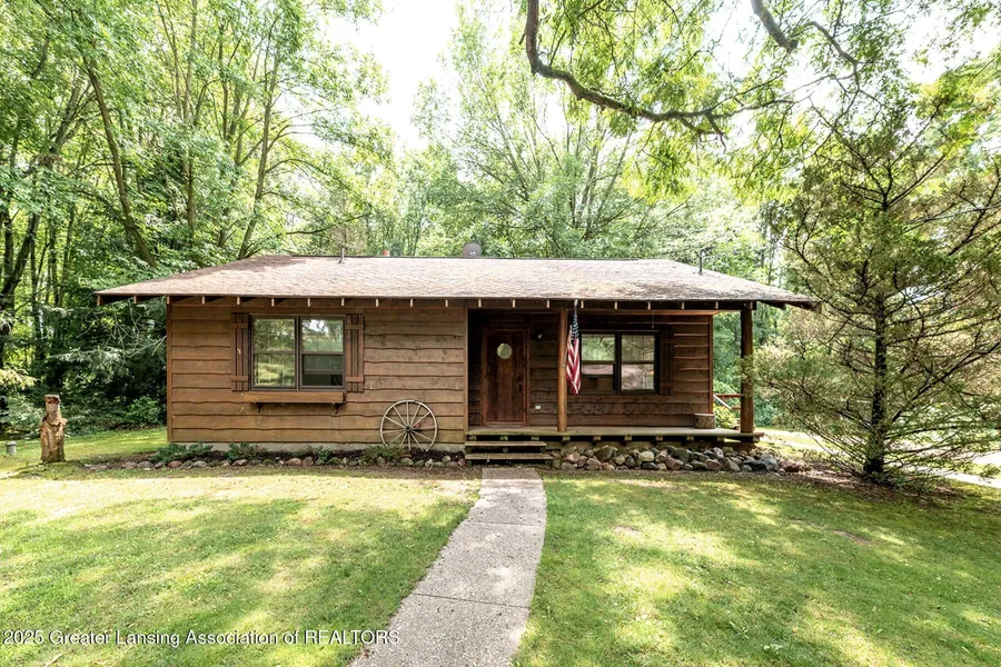 Whispering Woods - Charming 2-Bedroom Retreat on a Serene Wooded Acre. Welcome to this handsome, solidly built 2-bedroom home nestled on a peaceful 1 acre lot, crafted by Fulton Construction in 1986. With 1,269 finished sq ft, this cozy retreat sits just outside the Webberville city limits, an easy walk to town and the Oak Lane golf course. Perfect for empty nesters or first-time buyers, this home features vaulted, beamed ceilings and an open floor plan that welcomes natural light through numerous windows. The spacious living room offers a warm and inviting atmosphere, while the kitchen boasts an eating area and sliding doors that open onto a huge wrap-around deck — ideal for outdoor entertaining or quiet relaxation. Inside you'll find two sizable bedrooms and a full bath. The convenient first-floor laundry, located just off the kitchen, offers cabinet storage and side entry access for added functionality. Additional highlights include: Plenty of storage throughout, full basement with high sidewalls and exterior Bilco door access, all windows fitted with screens, beamed wood ceiling accents, newer roof, and two outside water spigots. The beautifully landscaped lot is filled with mature, flowering trees and bushes such as lilacs, peonies, and hostas, creating a serene, private setting. A two-car detached garage with storage space above completes this delightful package. With easy highway access, only 3 miles to I-96 and 5 minutes to Diederich's Market on Grand River, this home offers the perfect blend of country tranquility and convenient commuting.