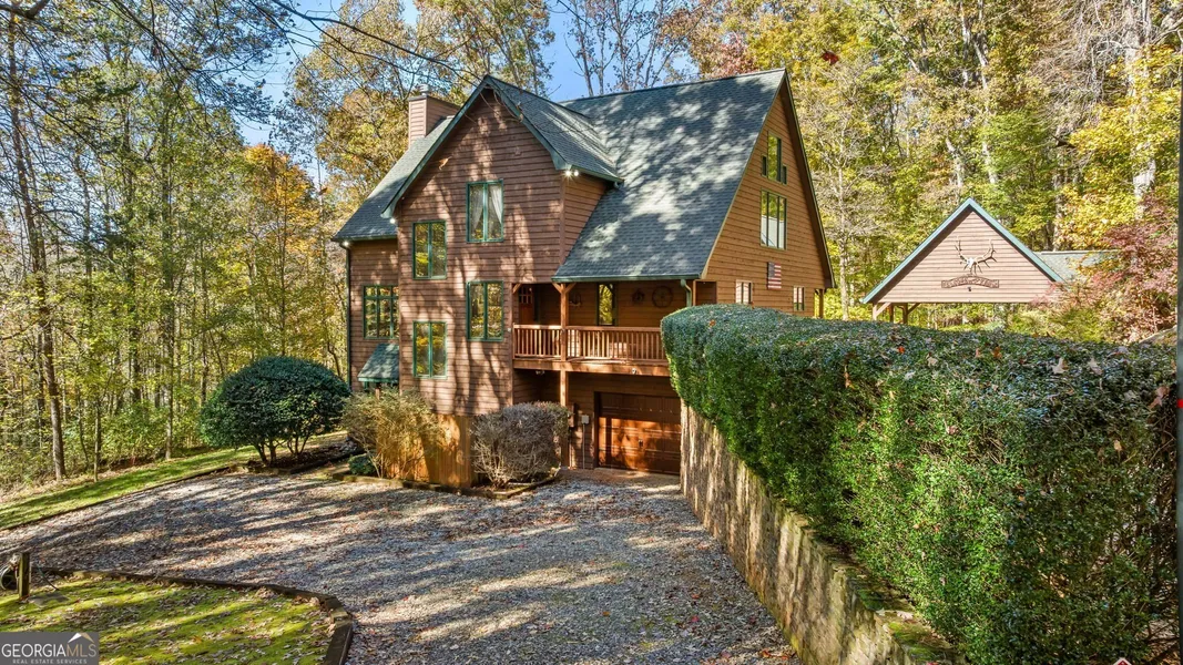 Rustic Elegance in the Heart of Batesville. Escape to this country retreat surrounded by 6.55 acres of hardwoods bursting with color. Perfectly situated near Helen, Sautee, and Lake Burton, this 3-bedroom, 3-bath cedar cabin blends timeless craftsmanship with modern comfort. Inside, soaring pine beams, tongue-and-groove ceilings, and rich hardwood floors frame an open great room anchored by a stunning stone fireplace. Step out onto the inviting screened porch and let birdsong be your only soundtrack. Upstairs, a cozy loft with office or nursery nook and a spa-style tiled shower add warmth and charm. The terrace level is made for entertaining, complete with a den, second fireplace, wet bar, pool table, full bath, and workshop-with its own private drive for easy access. A covered breezeway connects to a two-car carport and heated/cooled home gym. The entire property is fully fenced, offering your four-legged companions acres to roam. Peaceful, private, and picturesque, this is mountain living at its best.