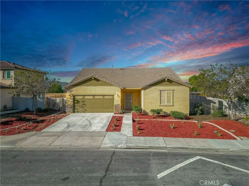 Welcome to 1074 Eden Valley, San Jacinto, CA — a beautifully maintained, 1 story home offering modern comfort, functionality, and style minutes away from a neighborhood park! Built in 2019, this 3-bedroom, 2-bath residence features a highly desirable open-concept floor plan. Step inside to find fresh interior paint, luxury vinyl plank flooring, new carpet in bedrooms, and wide hallways that enhance the home’s spacious feel. The heart of the home is the chef-inspired kitchen, complete with granite countertops, ample cabinetry, a walk in pantry, and a generous center island with seating for four—perfect for casual dining and entertaining. The sink is conveniently located in the island, keeping the space open and social.