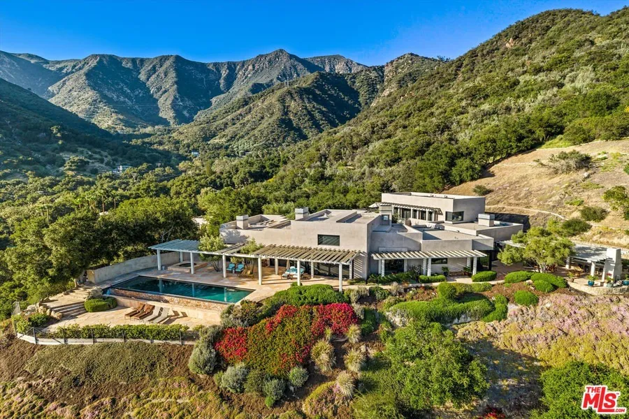 Located in a tranquil corner of Toro Canyon with sweeping views, just moments from Montecito and Summerland, this extraordinary 9-acre estate offers a rare blend of privacy, architectural pedigree, and natural beauty. A newly reimagined sanctuary, the property features a striking main residence and a charming guesthouse, thoughtfully placed amid lush landscaping and expansive outdoor living areas. Completed in 2025, the main residence reflects a curated fusion of Modernist and Japandi influences, all brought to life under the vision of renowned architect Robert ''Bob'' Easton. Inside, calm sophistication reigns. The spacious living room is anchored by a dramatic 17-foot slat-vaulted, open-beam ceiling, a sculptural fireplace, and sliding doors opening to a pergola-covered terrace. Portuguese limestone floors and slate-gray plaster walls set a serene tone throughout the main level. The gourmet kitchen is appointed with sleek black granite countertops, custom cabinetry, and top-tier stainless appliances. Nearby, an approximately 500-bottle temperature-controlled wine room offers both convenience and luxury. Both the primary and secondary bedrooms feature spa-inspired ensuite baths, generous closets, and access to multiple pergola-shaded terraces-each designed to invite indoor-outdoor living at its finest. Outdoor highlights include a sparkling infinity-edge pool, in-ground spa, built-in Wolf BBQ, and an alfresco dining area-all perfectly suited for entertaining or quiet repose. Enhanced by advanced home automation and fire prevention systems, this exceptional estate is where modern serenity meets timeless California style.