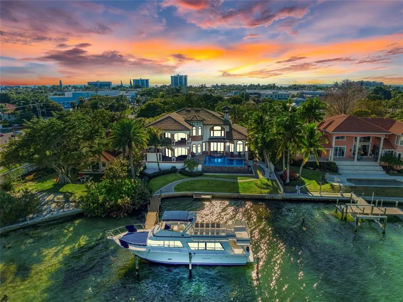 This St. Armands bay front home is a boater's paradise located in between two of Sarasota's largest passes with crystal clear waters and quick access to the Gulf of Mexico. Positioned between downtown Sarasota and the Lido Key Beaches, this residence has very rare, deep-water dockage to accommodate larger yachts with room for jet skis and an additional boat without blocking the mile-wide views. The architecturally designed home on a double lot, was extensively refreshed in 2020 to enhance a casual, yet luxurious feel. Entering through the gates, you will appreciate the many details, finishes, and materials throughout, including the imported Cantera stone. As you enter through the mahogany double doors into the great room with fireplace, open staircase and wet bar area, you appreciate the expansive views of the double-edged infinity pool and spa overlooking the bay. Designed for entertaining, the chef-inspired gourmet kitchen with Wolf and Sub-Zero appliances, includes two hammered stainless-steel sinks as well as dual dishwashers which can handle everyday family dinners to lavish parties. Enjoy your meals in the separate dining room, eat-in nook or the multiple outdoor spaces. The private, first floor master suite has its own wet bar, sitting area overlooking the pool and bay, walk-in closet and spa-like his and her bathroom with soaking tub, and double entry, multiple jet shower that will complete your home-spa experience. With three additional en suite bedrooms on the first floor there is plenty of space for a large family or guests. The garages offer three-car ground floor parking, or you can utilize a lift system to house up to six vehicles. Additional features include an elevator, outdoor summer kitchen, indoor/outdoor state of the art sound system with Apple I-Pads, multiple zone air conditioners, Advantage lighting and security systems. The open plan on the second floor includes a media/game/billiard room with lit quartzite wet bar and bay front sitting area. The large outdoor terrace provides spectacular views of the bay and downtown Sarasota while watching dolphins, birds and fish playing in the emerald-green waters. You will also find a library/sitting area along with another master suite, luxurious bath, and private balcony that overlooks famous St. Armand's Circle. The executive office has sweeping water views along with a separate 1,000 bottle temperature-controlled wine room. The spacious pool deck has plenty of room for relaxing, dining, swimming and lounging. Walk down to the dock, kayak and paddleboard launch on 100 ft. of bay frontage; perfect for casting a fishing line. You can have it all in this very special home within walking distance to St. Armand's Circle, Lido Beaches and downtown Sarasota, where you can enjoy upscale dining, shopping, live music, theater, art galleries and so much more!