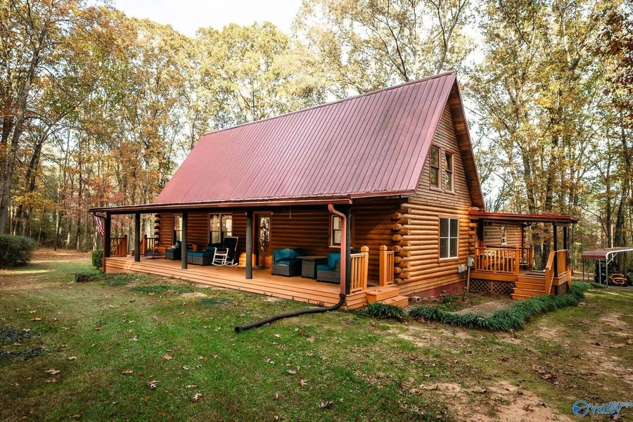 COZY CABIN on 4.4 acres with salt water pool & hot tub! NEED PRIVACY? This home is secluded with plenty of outdoor space to relax! Log construction with vaulted ceiling in living room and stone fireplace to set the ambiance. Opens to eat in kitchen with new appliances, leathered granite and new backsplash. Primary suite with updated bathroom, 2 sinks, walkin shower and tub - large closet - access to back porch/hot tub. Vaulted ceilings in rooms upstairs and log walls throughout give mountain vibes. Fully fenced yard with electric gate, detached 2 car garage and carport, covered porches, beautiful hardwood trees make a parklike atmosphere! No HOA Priceville Schools - Easy commute to Arsenal.