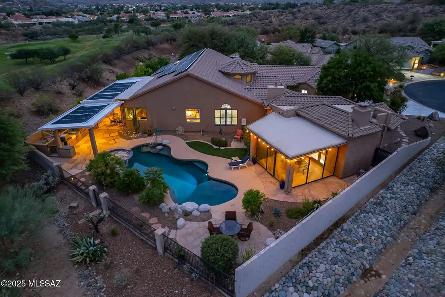 Fabulous retreat in SaddleBrooke One - a unique entertainer's paradise! With 3,578 SF (per prior appraisal), this home offers 2 bedrooms plus an office, 2 full and 2 half baths. The chef's kitchen impresses with Sub-Zero fridge, Wolf cooktop and wall ovens, pot filler, warming drawer, ice maker, wine fridge, and large granite island with prep sink. Entertaining spaces abound—wet bar off the kitchen and family room, recreation room with fireplace, pool table, bar, and Arizona room access. The backyard is spectacular with mountain views, heated salt pool and spa, outdoor kitchen, fireplace, and citrus trees. The luxurious primary suite features its own fireplace, reading area, and spa-like steam shower. Living room & library greet you at front of house. Owned solar for home and pool!