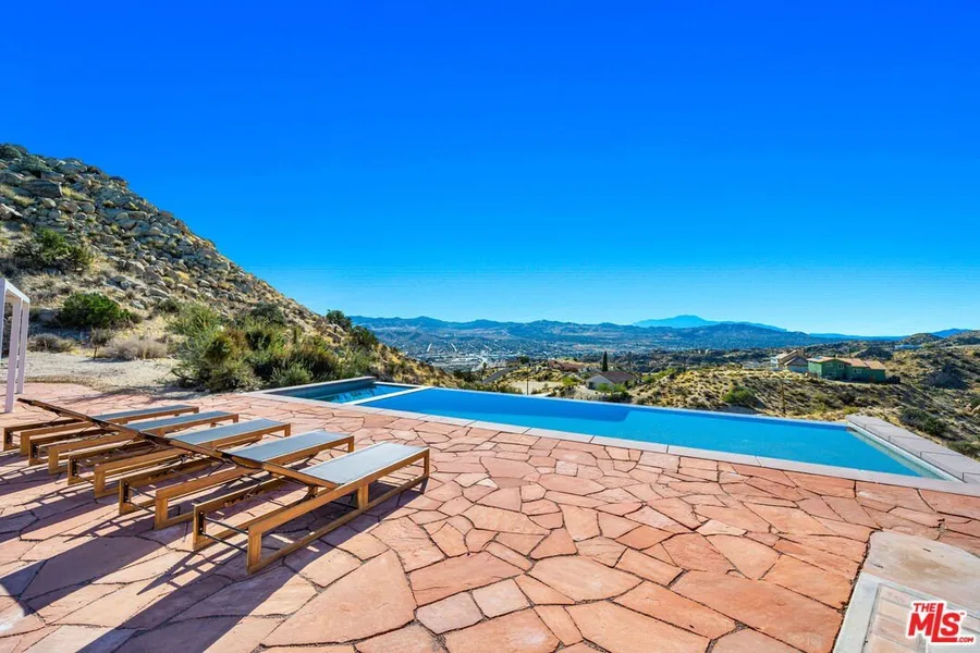 PRICE REDUCED & READY TO SELL! Spectacular 4-Bedroom Desert Estate with Infinity Pool, Panoramic Views & Custom Finishes on 2.5 Acres. Welcome to your private hillside oasisan architecturally distinctive 4-bedroom, 2.5-bathroom home offering approximately 3,400 square feet of beautifully crafted living space, perched on 2.5 acres with unobstructed high-desert and mountain views. This one-of-a-kind property is perfect for those seeking luxury, privacy, and dramatic natural beauty. From the moment you arrive, the gated entry and circular drive set the tone for this custom Spanish-influenced retreat. A tiered fountain anchors the front courtyard, surrounded by low-maintenance desert landscaping and mature native plants. Step through hand-carved double entry doors into a grand living space where vaulted tongue-and-groove ceilings soar overhead and massive picture windows frame jaw-dropping views. A striking stone fireplace serves as the centerpiece of the great room, seamlessly connecting indoor living to the expansive outdoor entertaining areas. Designed for both comfort and entertaining, the open-concept floorplan includes a stunning chef's kitchen with quartz countertops, artisan backsplash tile, custom open shelving, stainless steel appliances, and wraparound corner windows that capture endless desert light. A charming dining nook adorned with three stained-glass arched windows and wood-paneled walls offers an intimate setting for meals with family and friends. The luxurious primary suite features its own private slider to the pool patio, mountain views, and a beautifully designed en-suite bath. Three additional bedrooms provide ample space for guests, a home office, or creative use. Throughout the home, you'll find curated finishes including handcrafted lighting, vintage tile, wood floors, and rustic design details that enhance the home's warm and welcoming character. The resort-style backyard is the crown jewel of the property. An infinity-edge pool and spa appear to spill directly into the horizon, while the flagstone pool deck offers multiple lounge areas, fire pit, and a setting unlike any other. Whether you're hosting sunset gatherings or enjoying serene morning coffee with a view, this space is designed to inspire. Other highlights include a detached bonus structure (perfect for a studio or guest use), ample parking, and proximity to hiking, downtown amenities, and Joshua Tree National Park.