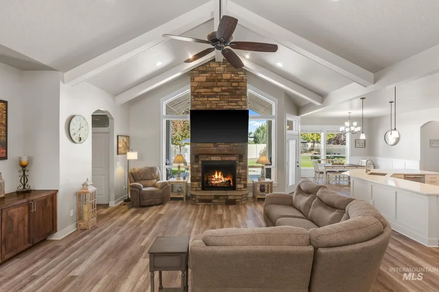 Located in one of Star's most sought after subdivisions; The Lakes at Pristine Springs. This beauty blends comfort, & cozy with grace and elegance. Front entry opens to a gorgeous great room with soaring ceilings, fabulous stone fireplace, a beautiful built -in & loads of windows providing the perfect amount of natural light. Great room seamlessly flows into a chef’s dream kitchen and dining area. Kitchen features white cabinetry, quartz countertops, double ovens, gas range, built-in microwave, spacious island, and a walk-in pantry! The primary suite is light, bright and very spacious. Includes private access to patio. Spa-like ensuite features dual vanities, a soaking tub, walk-in shower as well as a walk-in closet. Second bedroom is a junior suite. Perfect for family members and/or guests. Third bedroom as well as office/den are also generously sized and offer flexibility to suit all needs. Covered patio opens to a beautiful water feature, ample room for patio furniture and your favorite BBQ or smoker. Generous lot size features well manicured landscaping and is fully fenced with vinyl fencing. Garage and RV bay are the ultimate wow factor! Includes a 240 hookup as well as spicket for hose bib. Perfect for vehicles, RV and any additional toys! Home is plumbed for central vac.