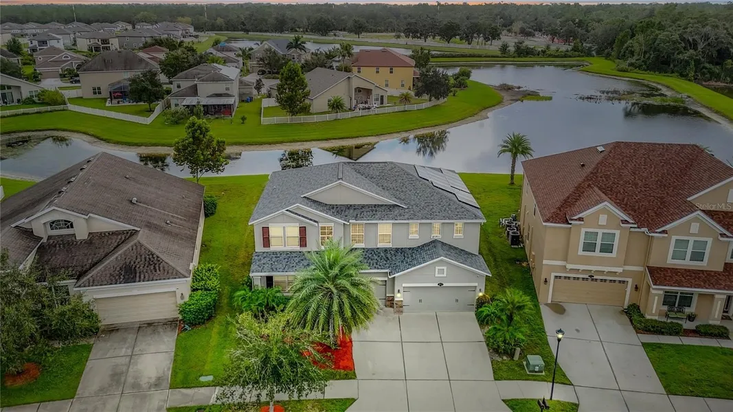 OVERLOOKING A SERENE WATER VIEW and surrounded by nature and neighborhood charm, this 5-bedroom, 3-bath home in Easton Park offers the perfect balance of space, serenity, and convenience. Designed for both entertaining and everyday comfort, the open floor plan features soaring ceilings, elegant details, and light-filled living areas that instantly feel inviting. The GOURMET KITCHEN overlooks the family room and outdoor living space, complete with 42-inch cabinetry, stainless steel appliances, granite countertops, a glass tile backsplash, and an oversized island perfect for gatherings. The primary suite is EXCEPTIONALLY SPACIOUS, offering hardwood floors, plantation shutters, a cozy sitting area, and a spa-like bath with a garden tub and separate shower heated by a tankless water heater. Upstairs, a versatile bonus area provides the perfect spot for work, play, or movie nights, while a first-floor bedroom offers flexibility for guests or a home office. Step outside to your private backyard paradise - a beautifully upgraded screened patio featuring a stone-accented OUTDOOR KITCHEN and bar, built-in beverage cooler, gas fireplace, and plenty of space to unwind while taking in the stunning pond views. Recent updates include a NEW roof and solar panels, combining comfort, efficiency, and peace of mind. Residents of Easton Park enjoy a resort-style pool, park, and playground—all surrounded by the scenic beauty of Flatwoods and Hillsborough River State Parks, with easy access to Bruce B. Downs, USF, and I-75 for a quick commute and convenient city connection. Don’t miss your chance to make this waterfront retreat your next home! *** Age of Roof - 4 months, Age of A/C - 10 years