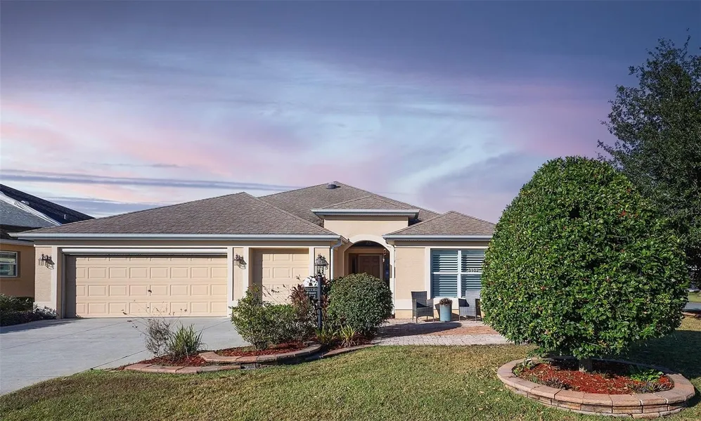 Welcome Home to this beautifully maintained IRIS model located in the desirable Village of Sanibel, perfectly positioned on a LARGE CORNER LOT lot with classic Florida landscaping, flowering palms, and a pavered patio that creates inviting curb appeal from the moment you arrive. Step inside to an open, light-filled floor plan featuring engineered wood and tile flooring, volume ceilings, and seamless flow through the living and dining areas, ideal for both everyday living and entertaining. The kitchen is thoughtfully designed with GRANITE countertops, stainless steel appliances, ample cabinetry that includes 2 add'l pantry cabinets flanking the eat-in nook space, and open sightlines to the main living spaces, making it a natural gathering point for family and friends. The spacious primary suite offers ABUNDANT NATURAL LIGHT, a generous walk-in closet with customized storage, and a relaxing retreat at the end of the day. Primary bathroom is appointed with double vanities, a spacious step-in shower with a bench. Two guest bedrooms are well separated for privacy and both feature customized closets, providing comfortable accommodations for visitors or flexible space for hobbies or a home office. The guest bathroom is nicely appointed with granite and a tub/shower combo. At the rear of the home, the enclosed lanai with privacy shades creates a peaceful extension of the living space, perfect for enjoying the Florida lifestyle year-round. Completing the home is a convenient 2-plus GOLF CART GARAGE with utility sink, offering excellent storage and convenience. HVAC approx 2 years old. Built in 2012. Ideally located just minutes from Brownwood Paddock Square and Lake Sumter Landing, the Village of Sanibel provides easy access to executive golf courses, recreation centers, pools, shopping, dining, and nightly entertainment, making this home an exceptional opportunity to enjoy everything The Villages lifestyle has to offer.