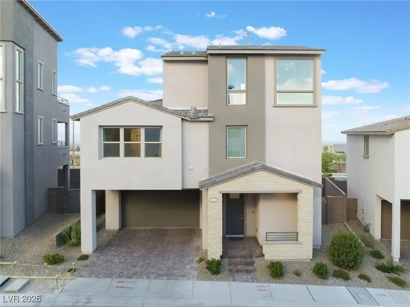 Discover one of the finest homes in the community! This stunning residence showcases breathtaking Strip & city views from two patios on the second & third floors, as well as from the living room, dining room, & kitchen. Expansive windows flood the home with natural light by day & reveal spectacular city lights & Strip views by night. The thoughtfully designed floor plan features two primary bedrooms, each with its own private bathroom, plus a downstairs office with a convenient powder bath. The extensive list of upgrades includes state-of-the-art cabinetry with self-closing hinges & drawers, sleek stainless hardware, & contrasting granite countertops in both the kitchen & bathrooms. Walk-in showers feature custom pebble floor finishes, while the primary bathroom offers elegant backlit mirrors. Recessed lighting throughout further elevates the ambiance. No expense was spared in the design of this exceptional property—offering luxury, style, & unforgettable views in every direction.