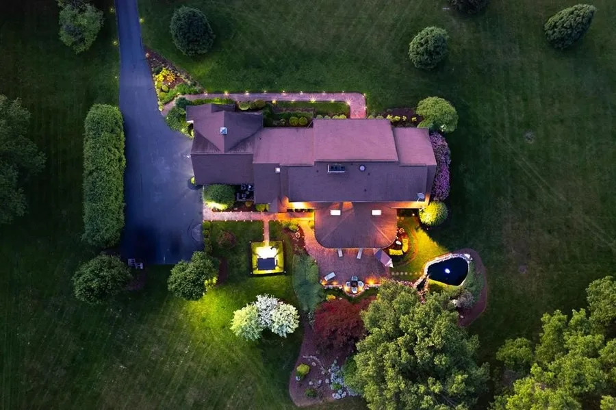 This beautifully maintained 9 acre, 5,000-square-foot estate features an impressive four-bedroom, three full bath, two half baths with magnificent views, walking trails and complete privacy. The home boasts two stone fireplaces and numerous recent upgrades and renovations throughout. The main-level primary suite includes a fully renovated ensuite bath, while a second primary suite is located on the upper level. The main-level ensuite bath is completely updated with a stunning blue glass-tiled shower, sliding barn-style glass doors, a ceiling fan with heat, and a large walk-in closet. The property also features two unique ponds, one filled with giant Koi fish. The home offers a formal entry foyer and a beautiful formal living room with five curved French-style windows and a marble fireplace. In the family room, you'll find a stone-walled propane fireplace, custom glass cabinetry, wooden beams, and a new sliding glass door that opens to a large covered patio with marble decking. The fully remodeled kitchen includes soft-close cabinetry, upgraded countertops, top-of-the-line appliances with custom stone backsplash and walls. A redesigned pantry with two sliding barn doors and a broom closet adds function and charm. The formal dining room comfortably accommodates an eight-person seating arrangement. The finished basement includes a new kitchenette with a two-burner stove, refrigerator, freezer, and sink, along with a spacious entertainment area featuring a stone fireplace and a brand-new half bath. A large, separate area provides ample storage space. Front and rear walkways have been updated with all-new premium pavers. Additional features include new triple-insulated garage doors and openers. Privacy and elegance throughout! Schedule a showing to experience this beautiful estate today!