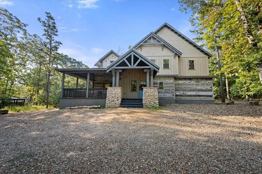 The outdoor living is just as impressive, boasting a 3/4 wrap-around covered deck with fireplace, cozy seating, and a hot tub for soaking under the stars. A fire pit framed by string lights provides the perfect spot for stargazing and evening gatherings.