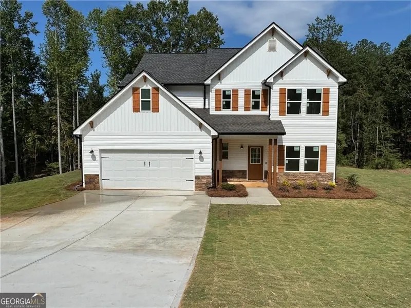 Charming 2-Story Farmhouse on 5 Scenic Acres. Welcome to this stunning 3-bedroom, 2.5-bath farmhouse-style home that blends rustic charm with modern comfort. Nestled on 5 peaceful acres, this beautifully designed residence also features a private dedicated office space, loft area, and an open-concept layout perfect for both everyday living and entertaining. Step inside through a welcoming foyer that leads past a formal dining room, a convenient half bath, and a coat closet, opening into a true chef's kitchen. Enjoy white cabinetry, a large center island, a farmhouse sink, built-in display cabinet and buffet, modern backsplash, and stainless steel appliances-including range, microwave, and dishwasher. The spacious eat-in kitchen overlooks the family room highlighted by an electric fireplace with a marble surround and a tastefully shipped lap accented wall. Luxury vinyl plank (LVP) flooring runs throughout the main level, complemented by beautiful lighting fixtures and access to a back patio with views of your expansive property. Upstairs, the primary suite impresses with a tray ceiling, eye-catching accent wall, and a generous walk-in closet. The en-suite bath offers a double vanity, large soaking tub, tiled accent walk-in shower with bench seating, and ceramic tile floors. Two additional spacious bedrooms share a full bath and offer ample closet space. A versatile loft area and a dedicated laundry room complete the upstairs living space. Additional features include a 2-car garage with automatic opener and a custom-built hall tree for added convenience and style. This is country living at its finest-don't miss your chance to make this dream home your reality! TRACT 1 on Survey. Preferred lender incentives also available up to 1%. USDA Loan with 100% Financing Available