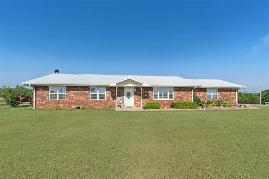 This beautifully maintained 3-bedroom, 2-bath home sits on just over 9 acres at the corner of Carpenter Place and Highway 177, offering both convenience and privacy. The spacious interior includes a custom kitchen with granite countertops and a French door refrigerator that remains with the home. The main living area features a cozy gas fireplace and updated laminate flooring installed in 2022. The primary suite boasts a large walk-in shower and a double vanity, while fresh paint and abundant storage enhance the home's appeal throughout. A heated and cooled sunroom provides additional living space perfect for year-round enjoyment. Outside, the property is well-equipped with a fenced backyard, two ponds, and cross-fencing suitable for livestock. Additional amenities include a nearby storm shelter, a concrete-floored shed with electricity and a loft, and a drive-through shed for added util...