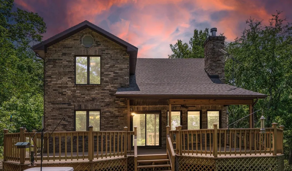 Welcome to your private slice of paradise on the peaceful shores of Table Rock Lake. Set on 1.95 secluded acres, this all-brick, one-owner home is a rare gem. Meticulously maintained since its construction in 1999, this property reflects pride of ownership and enduring quality at every turn. Step onto the welcoming front porch and into an open-concept interior with 2016 square feet of well-designed living space. The main level features a warm and inviting living area anchored by a stunning stone fireplace, perfect for cozy gatherings. The kitchen is equipped with high-end appliances including a Bosch gas range and new refrigerator. A generous island, rich hardwood flooring, and a spacious dining area set the stage for memorable meals and family moments. A mudroom, half bath, and washer/dryer (included) add everyday convenience. The main-level primary suite serves as a peaceful retreat. Upstairs, a versatile loft offers plenty of space for a second living room, office, or bunk room, along with two additional bedrooms and a full bath. For the lake enthusiast, the oversized 4-car garage is a dream come true--with 12-foot doors, a workbench, and ample room for a boat, tractor, vehicles, and lake toys. When it's time to relax, the partially covered back deck offers views of the wooded valley, lake, and abundant wildlife--ideal for morning coffee or sunset unwinding. This home was built to last, with solid brick and stone construction, 6-inch exterior wall studs, tongue & groove pine, solid wood doors, and zoned HVAC. Added features include a water softener/filtration system, a whole house generator, and a 1,000-gallon propane tank for reliable comfort. Recent updates include a new roof and a new water heater--ensuring peace of mind for years to come. Outdoor features abound, including a 100-yard rifle range with bench and bullet trap, and easy access to a nearby community boat dock. A 12x28 boat slip with locker and jet ski lift is available for purchase. Located on the