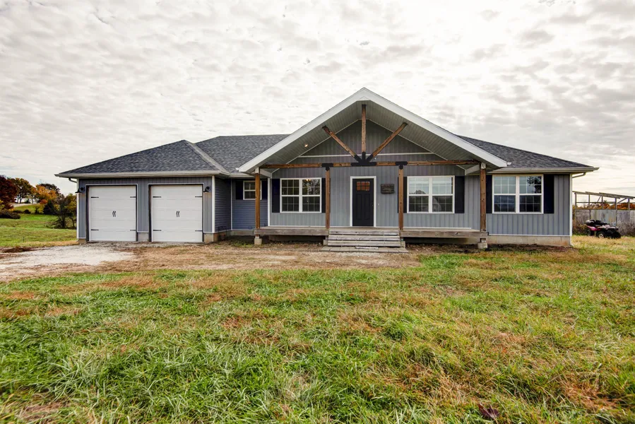 Modern Farmhouse on 5 Acres in Clever Schools! Built in 2020, this beautiful 3-bedroom, 2-bath home offers the perfect blend of modern farmhouse style and peaceful country living. Featuring an open, split-bedroom floor plan with approximately 1,559 sq. ft., the spacious living, dining, and kitchen areas are highlighted by soaring vaulted ceilings with striking wood beams and abundant natural light. The kitchen is a showstopper with white cabinetry, black-and-white granite countertops, a stylish tile mosaic backsplash, and stainless steel appliances. The master suite includes a walk-in closet, dual vanities, and a walk-in shower. Both bathrooms are tastefully designed with contemporary finishes throughout. Enjoy relaxing on the large covered front porch or the back porch overlooking your private 5-acre property--complete with fencing, a pond, and peaceful countryside views. With its modern design, move-in ready condition, and sought-after Clever schools, this home offers the best of comfort and country charm!