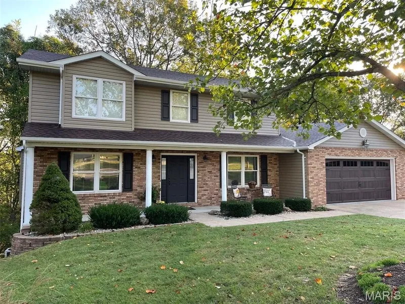 You will want to see this beautiful 2-story on a sought after street in Festus! This home has great curb appeal. The owners have loved this home for 32 years! Come live on Blue Ridge Trace just a mile from West City Park and all it has to offer. This well-maintained 3-bed 4 bath home has two large main level living spaces, a big kitchen w/lots of storage, pantry, separate breakfast area, bay window and screened porch off the kitchen (w/porch tv that stays w/the home). There is even room for an island if you would like to add it. The stainless steel refrigerator stays with the home. The separate dining space is lovely with its hardwood floors that flow from the 2-story entry. The primary bedroom is large with a walk-in closet & primary bath with soaker tub and newer Onyx oversized-shower. The two additional bedrooms are spacious and bright. Vinyl windows are double hung for easy cleaning on any level. The LL has a huge rec area and office nook. There is room to build a 4th bedroom in the LL if you want to adjust the layout. A covered porch off of the rec area adds more space to relax and enjoy the outdoors. The show stopper for the man in your life is the 21x21 concrete storage area under the garage with access from the inside or outside. But wait! There is an additional concrete shed area for your riding lawn mower and other toys. The oversized 2-car garage has epoxy floors to help keep it clean. Property backs to 30 acres of unbuildable common ground overlooking Joachim Creek. New roof, siding, gutters, fascia, shutters, garage door, and man door in 2024. Freshly painted in 2025. Blink camera system excluded.