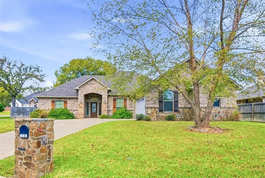 Beautiful single-story brick and stone home offering a functional layout with 3 bedrooms, a dedicated office (or 4th bedroom), and 2.5 baths has just become available for you to own. The open-concept design connects the living, dining, and kitchen areas, highlighted by hardwood flooring, crown molding, and a stone fireplace. The kitchen includes granite countertops, stainless steel appliances, a gas cooktop, a center island, a secondary serving island, tile backsplash, and generous cabinet storage. A separate office with built-ins provides workspace or study flexibility. The split layout places the primary suite on its own side of the home, featuring a large bedroom, dual-vanity bath, separate tub and shower, private water closet, and an oversized walk-in closet with built-ins. Two additional bedrooms share a full bath, and a half bath serves the main living spaces. Exterior features include a covered front entry, covered back patio, fully fenced backyard, mature trees, and a detached storage building with matching brick detail. A side-entry garage and extended driveway add convenience. Property includes a floor plan for additional clarity. Only a short drive to the South Tyler retail and dining corridor, offering access to shopping, restaurants, and essential services.