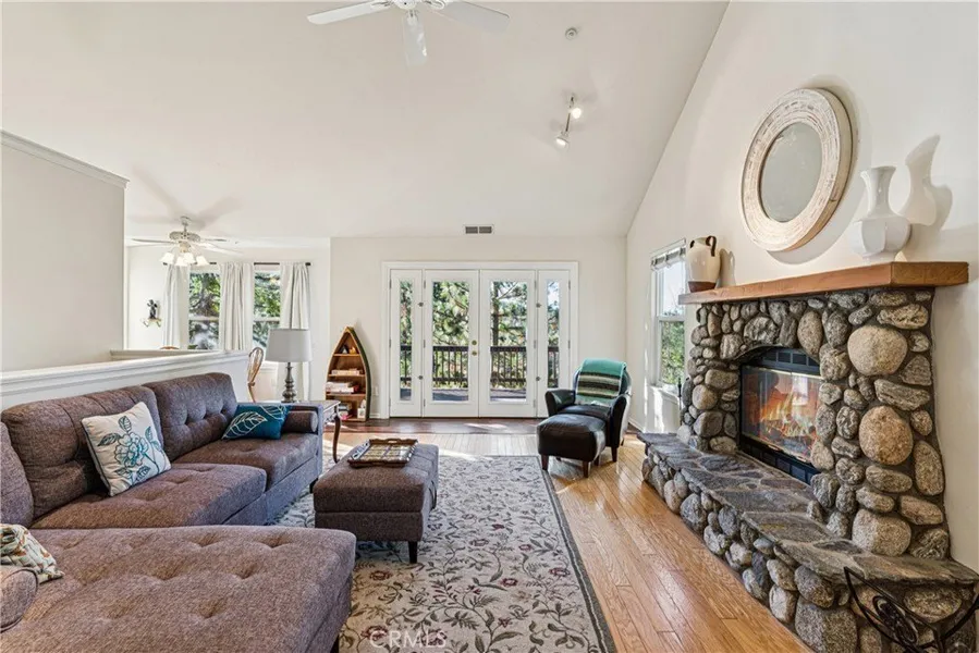 Bright, cheerful, and beautifully convenient - this lake rights home offers year-round enjoyment with easy access and level parking plus a garage. The inviting living room features a stunning river rock gas fireplace and brand-new French doors that open to a sunlit deck perfect for relaxing summer evenings or taking in the tree-lined views. Inside, the kitchen impresses with warm wood cabinetry, quartz countertops, a new sink, a roomy pantry, and a built-in desk area. Two of the three lower level bedrooms open to newly replaced decks, creating perfect spots for quiet morning coffee or evening stargazing. Both spacious bathrooms showcase fresh hexagon tile floors, adding modern style. The home sits in a peaceful loop neighborhood with a nicely fenced yard ideal for pets and outdoor living. Just a quick 5 minute drive brings you to Lake Arrowhead Village for shopping, dining, and lakeside fun, while Blue Jay’s two grocery stores, library and restaurants are equally close. A move-in-ready retreat with all the comforts of mountain living!