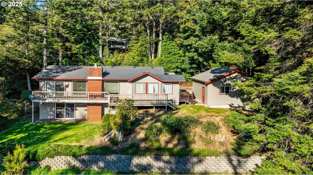 Enjoy end-of-the-road privacy and beautiful bay views from this spacious 4-bedroom, 2.5-bath home. Nearly bay-front, with just a narrow strip of timber-company land between you and the water. The home features a large open living room with a propane fireplace, plus a second wood-burning fireplace downstairs for added warmth and character. Thoughtful updates include new fiber-cement siding, all-vinyl windows, and numerous modern improvements throughout. One bedroom is outfitted with built-ins, making it ideal for a home office or study. Plenty of storage, public water, and a private septic system add convenience to this comfortable coastal property. A great blend of privacy, space, and scenic views—come see why this one stands out.