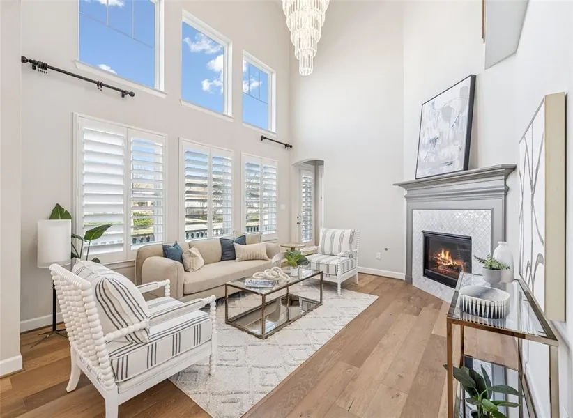 The main level showcases hardwood flooring, designer lighting, and plantation shutters, creating a timeless and elevated aesthetic. The chef’s kitchen is a standout with floor-to-ceiling shaker cabinetry, an oversized granite island, stainless steel appliances, and generous storage—ideal for both everyday living and entertaining. The kitchen flows seamlessly into the living room, where a 20-foot ceiling, dramatic wall of windows, custom fireplace, and statement chandelier create a light-filled, impressive gathering space.