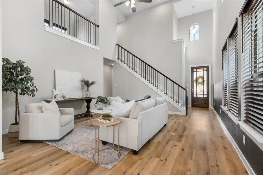 **INQUIRE ABOUT OUR 2-1 RATE BUY DOWN** Welcome home! Nestled in the highly sought-after Pecan Square community, this charming two-story residence offers comfort and style at every turn. Step inside to a warm and inviting living room with soaring ceilings that fill the space with natural light. The kitchen is a true centerpiece, featuring built-in cabinetry, a generous island with a convenient breakfast bar, and plenty of room for entertaining. Even better, the refrigerator stays, adding convenience from day one. A quiet home office with its own walk-in closet provides the perfect retreat for work or study. The serene primary suite is designed for relaxation, showcasing cool tones and soft natural light. Its luxurious ensuite bathroom boasts dual vanities, abundant storage, and a spacious walk-in shower. Upstairs, enjoy a versatile loft area ideal for a second family room, game room, or creative space, along with three additional bedrooms for loved ones or guests. The spacious layout is perfect for relaxing around the included 86 inch TV, creating a true gathering hub for memorable occasions. Outside, the low-maintenance backyard is ready for effortless entertaining. To make moving in even easier, the washer, dryer, additional freezer, and cordless Dyson vacuum will also remain with the home. This Pecan Square gem seamlessly blends comfort, functionality, and style, schedule your showing today!
