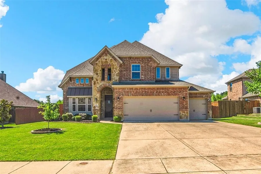Nestled in the serene Woodridge Estates, this stunning home offers space, comfort, and modern amenities—just minutes from Lake Lewisville, the upcoming Universal Kids Resort, PGA Frisco, The Star, and more. Inside, soaring ceilings and an open floor plan create a bright, inviting space. The living room features a beautifully crafted stone fireplace and flows into a granite-clad kitchen ideal for daily living. A formal dining room with coffered ceilings and a private office add elegance and function.