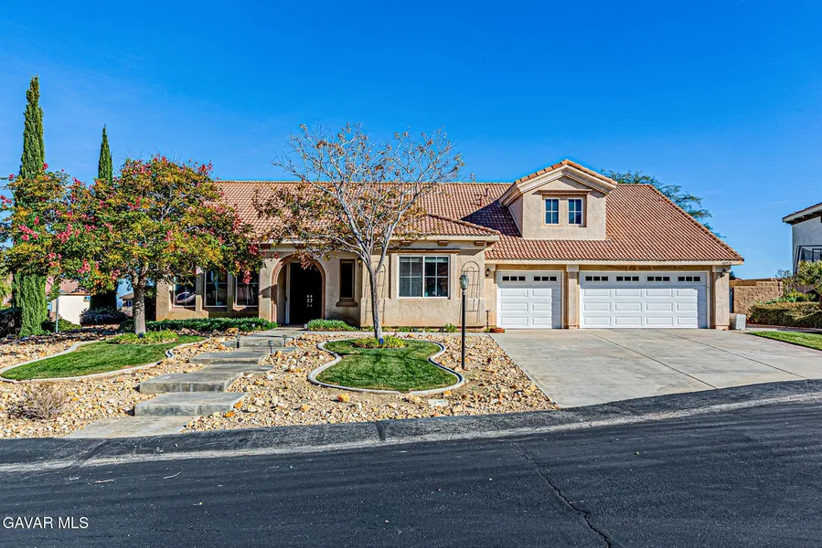 Welcome to this stunning corner-lot home located on a quiet cul-de-sac in the prestigious Renaissance gated community of West Palmdale. Surrounded by mature trees, lush landscaping, and beautiful mountain and neighborhood views, this elegant residence offers 3,607 sq. ft. of living space on nearly half an acre with RV access, built in 2004. This highly desirable floor plan features two full primary suitesa''one downstairs and one upstairs, ideal for multi-generational living or guest accommodations. The professionally landscaped front yard welcomes you with a custom walkway and a three-car garage. Upon entry, a tiled foyer opens to a spacious formal living and dining room with custom lighting and a built-in bar, perfect for entertaining. A double-door flex room near the entry offers versatility as an office, library, or den. The remodeled kitchen showcases upgraded granite countertops, subway tile backsplash, white cabinetry, and brand-new stainless steel appliances. A center island with seating, space for a dining area, and direct access to the backyard patio make it the heart of the home. The adjacent family room features a cozy fireplace, custom built-in shelving, and abundant natural light. The oversized downstairs primary suite offers a professionally organized walk-in closet and sliding glass doors leading to a sunroom. The spa-style primary bathroom includes dual sinks, vanity area, soaking tub, and walk-in shower. Upstairs, a large loft provides an additional living space, along with a second spacious primary suite with walk-in closet and full bath. Two additional generously sized bedrooms offer ample closet space. Built-in cabinetry and storage throughout the home add exceptional functionality. A separate laundry room with sink and storage enhances convenience. The private backyard retreat features a covered patio, custom walkways, lush lawn, mature trees, and block walls for maximum privacya''ideal for relaxing or entertaining.