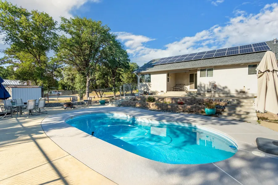 10844 Green Oaks Lane in Redding. It's located in NE Redding with country living in mind! This home is on 5.12 acres of land (Fully fenced & Gated Entry) with 3 bedrooms, 2 bathrooms, 1558 Sq ft of living space with a NEW ROOF and... your very own pond! There is LVP flooring, kitchen has been updated and even has granite countertops with stainless steel appliances. Backyard is a perfect place to entertain your friends and family or just unwind from a long day POOLSIDE. Enjoy this fully fenced backyard with covered patio and terraced landscaping down to in-ground pool. Don't forget about the shop! It has a large shop with full power and roll up door. Top it all off with the Owned Solar system for low utility bills. Really too much to list. Come see in person today!