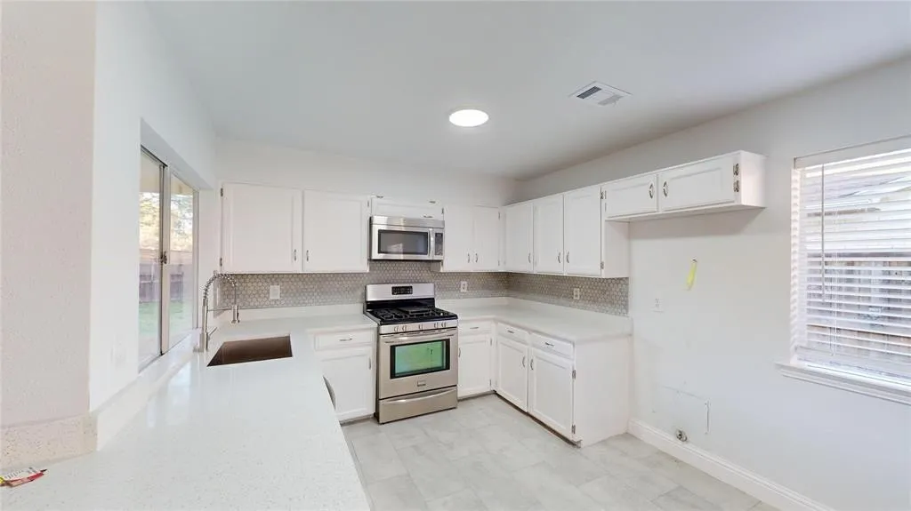 The kitchen is both stylish and functional, offering crisp white cabinetry, stainless steel appliances, generous counter space, and easy access to the backyard, ideal for indoor-outdoor living ...
