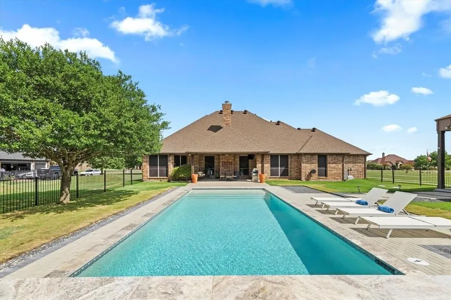Escape city life and retreat to your very own slice of paradise nestled on a peaceful 1.42 acre lot in the gated community of Lost Creek Estates. Updates include Tankless WH - 2023, Pool, Shop and 2 HVAC units - 2021, Roof with radiant barrier - 2020, Replaced Septic Tank - 2019, Sup pump and French drains 2025. A beautiful curb appeal with circle drive and brick with stone elevation greets you upon arrival. Extensive hardwood floors usher you inside this desirable open concept floor plan designed with entertaining in mind. Create memories to last a lifetime gathered with friends and family in the inviting living room highlighted by a cozy stone fireplace and breathtaking views of your tranquil backyard. Preparing holiday meals is a breeze in the gorgeous kitchen equipped with stainless steel appliances, dual ovens, gas cook-top and granite counter-tops. Enjoy a quick meal in the breakfast room or a formal gathering in the dining area, both flowing seamlessly into the kitchen. Relax and unwind in the primary bedroom accentuated with tray ceilings, large ensuite bath with dual sinks, jetted tub, separate shower and walk-in closet. Two good sized secondary bedrooms share a Jack & Jill bath with separate vanities. Lastly, grab a refreshing beverage and make your way to your serene backyard showcasing a sparkling swimming pool, two covered patio and plenty of yard for kids and pets to play. Don't miss the wonderful 4th car detached shop great for the car enthusiast in your family.