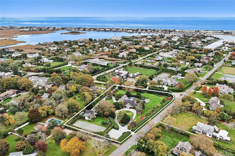 On over two acres, this Village estate is in close proximity to both vibrant Main Street and Dune Road's ocean beaches. Enter the gated estate through a circular drive off Bayfield Lane to the classic Dutch-doored front foyer. There is also a gated service entrance off Stevens Lane. A perfect weekend get-away or a year-round residence, this home boasts an expansive great room with soaring ceilings, exposed beams, and a gas fireplace. The handsome study, with wood-burning fireplace, and sunny all-seasons enclosed porch offer rooms for entertainment and relaxation. The eat-in kitchen has a large center island, ample pantry space, a classic Garland range, and an adjacent mudroom/ laundry room with a separate entrance. A generous primary suite, two additional bedrooms with a shared bath, and a powder room complete the first floor. The second story provides an additional en-suite, along with two more bedrooms with a shared bath. The sprawling hedged property includes mature landscaping, heated gunite pool, and tennis court. Two-lot subdivision is also in progress.