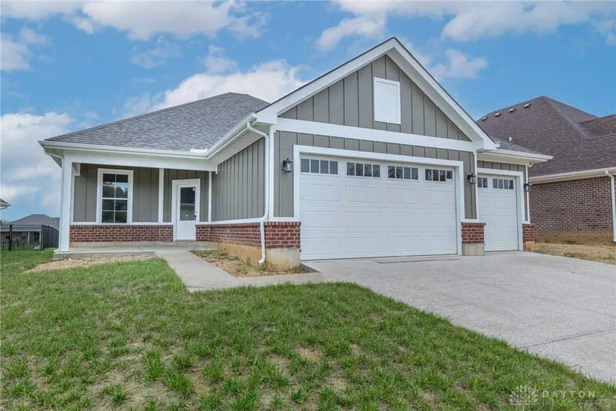 Brilliant design in Xenia's popular Wright Cycle Estates neighborhood! There's no wasted space in this beautiful brick and Hardie ranch featuring a full three-car garage! From the covered front porch, the angled entry provides privacy from the street. Inside, enjoy the front-to-back WIDE OPEN living space with stone-wrapped, oversized corner gas fireplace. The kitchen features beautiful, high-end white cabinetry with soft-close doors and drawers and pantry closet. Don't miss the stainless appliance package featuring a gas range! The dinette area is light and bright thanks to an oversized fixed-pane window and glass patio door. The Primary bedroom is nicely sized and complimented by an ensuite bath; including a double-basin vanity, custom tile and glass (to be installed) shower, private commode room and generous walk-in closet! Split from the Primary, the other side of the home include...
