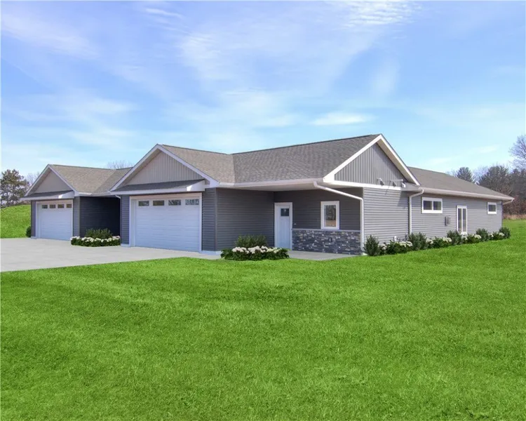 New construction twinhome in a 55+ gated community located between Eau Claire and Chippewa Falls, offering convenient access to Lake Hallie and nearby amenities including grocery stores, restaurants, gas stations, and freeway access. This twinhome features 1,632 square feet of living space with a functional layout and solid construction. Built on slab, each home includes 2–3 bedrooms, 2 full baths, zero-entry access, and an attached 2-car garage. Interior highlights include 9-foot ceilings throughout with a 10.5-foot tray ceiling in the main living area, providing a spacious and open feel. One side of the twinhome offers a private courtyard, while the other features a private side yard. The development will include 5 twin homes and 20+ condos with paved roads, and gated access for added privacy and security.
