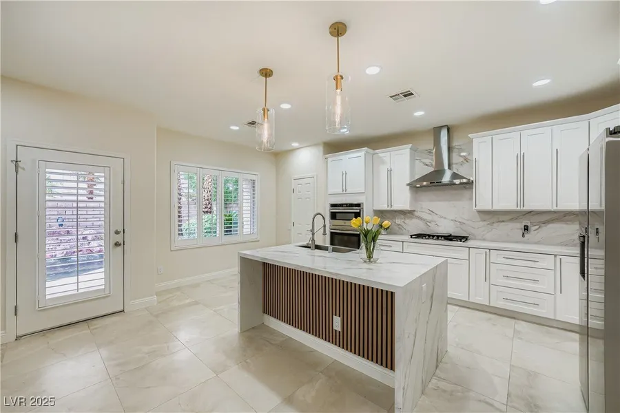 Stunning Remodeled Summerlin Home in The Paseos! Step into this beautiful 4-bedroom plus den residence, where modern elegance meets comfort. The brand-new gourmet kitchen features custom white soft-close cabinetry, quartz countertops, and sleek stainless steel appliances. An open-concept design is complemented by vaulted ceilings, all-new flooring, stylishly updated bathrooms, and classic shutters throughout. The luxurious primary suite offers a private covered balcony, a custom walk-in closet, and a spa-inspired bathroom featuring a frameless shower enclosure and a soaking tub. Outside, the backyard is perfect for entertaining or relaxing with a sparkling pool and spa. A 3-car garage provides ample storage and parking. Ideally located near community parks, scenic trails, and just minutes from dining, shopping, and entertainment at Downtown Summerlin.