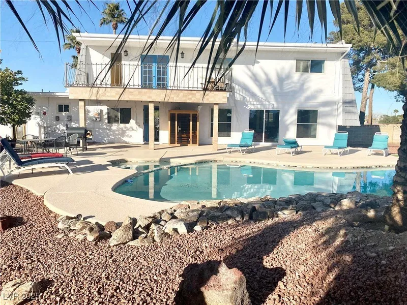LOCATION! LOCATION! LOCATION! Gated One of a Kind totally renovated 2-story home on Over 1 acre-with a second residence! No HOA! Within a few miles of the Raiders Stadium, McCarran Intl/LV Strip, and Town Square. Amazing home for entertaining!! Resort style large private Pool/Spa area, Tennis court, Sand Volleyball, Circular driveway (putting green). Mansard style home-sides are stone coated steel w/lifetime warranty. Roofing over garage & 2nd residence - replaced recently. Main house is 3,320 sf and 2nd residence/casita just over 700 sf. Inside, home features 5 bedroom, 3 1/2 bath, formal living room and dining room, family room/den with fireplace. Quartz countertops, Tile flooring recently installed throughout. Primary bedroom boasts a balcony. 2nd residence/Guest house has 2 bedrms, kitchen & bath. Great for add'l income or a family member. Solar panels leased through Sunrun - 31 pan...