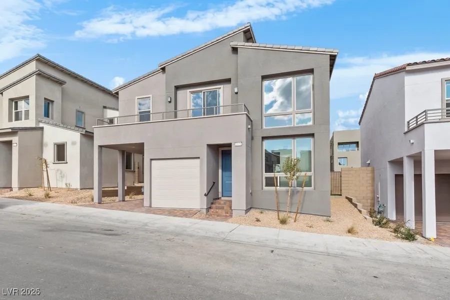 Welcome to your brand-new single-family home in the highly sought-after Kestrel Village at Summerlin West. This stunning residence features an open-concept design with a modern flair. The kitchen boasts 42" upgraded cabinets, sleek quartz countertops, stainless steel appliances, and recessed lighting. The spacious great room is bathed in natural light, thanks to floor-to-ceiling windows that create a warm and inviting ambiance. Retreat to the luxurious primary suite, complete with a frameless glass shower and a private balcony offering breathtaking views of the Las Vegas Strip. The enclosed yard is beautifully landscaped with turf and a patio, perfect for outdoor entertaining and low-maintenance living. Conveniently located near top-rated schools, parks, scenic trails, Red Rock Canyon, and Downtown Summerlin, this home offers unparalleled access to nature, entertainment, and modern conve...